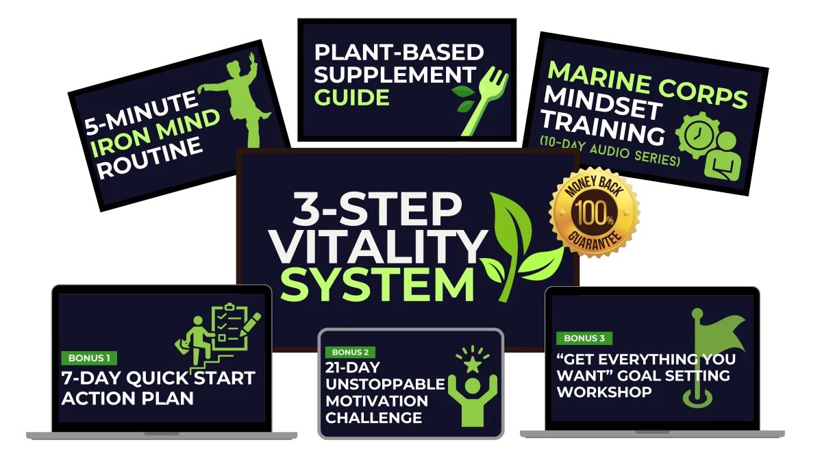 In fact, I’m so confident that you’ll love how quickly and effortlessly you’ll regain your energy, mental clarity, and passion for life using the 3-Step Vitality System…